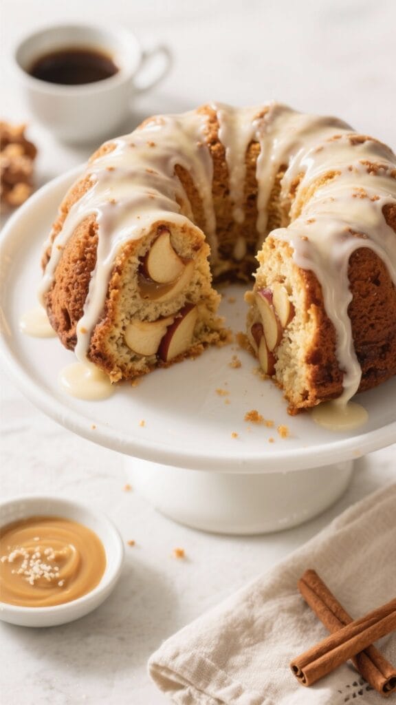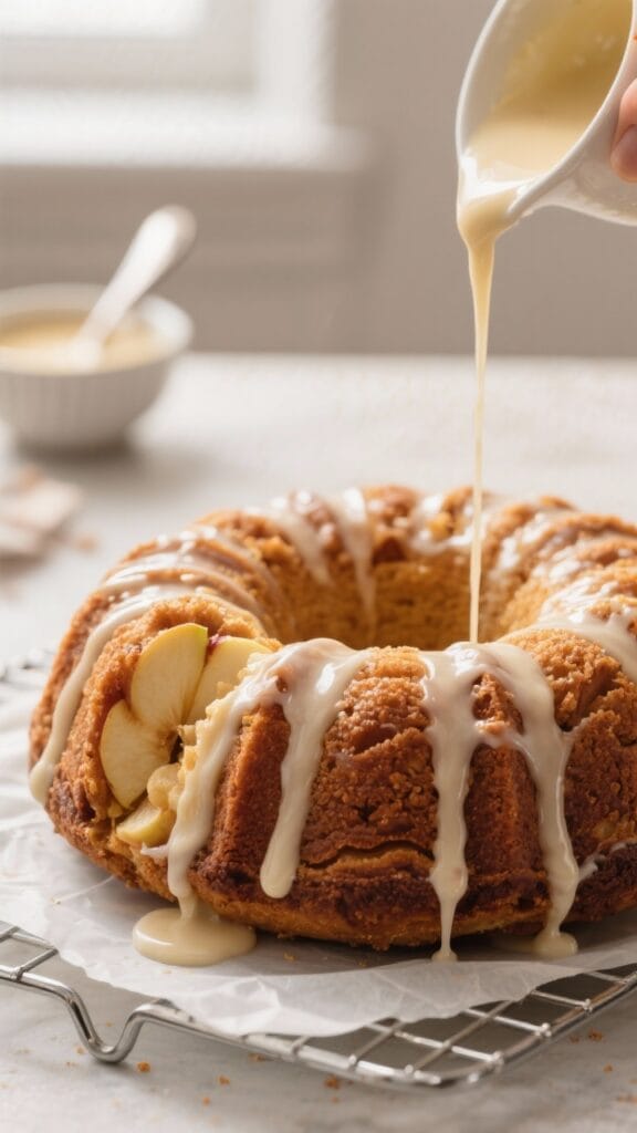 - Glaze: Whisk powdered sugar, milk, vanilla, and a pinch of salt until smooth and pourable. Drizzle over the cooled cake, letting it run down the sides.Let the glaze set for 15–20 minutes before slicing.