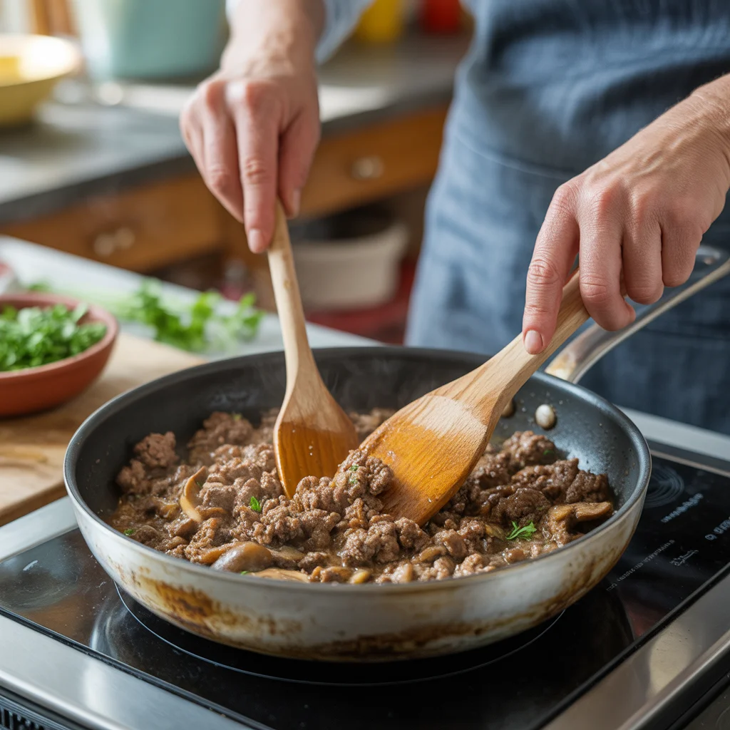 Start with browning your ground beef in a big skillet. Break it up as you go. Toss in diced onions and maybe a handful of fresh mushrooms if you like. Cook till everything smells amazing and the onions soften up.