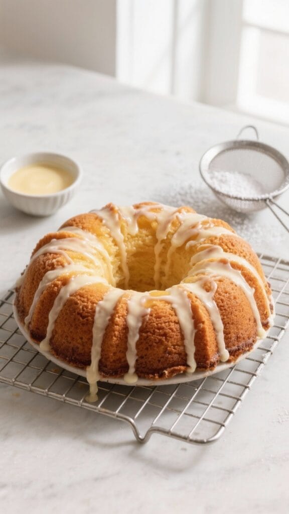 - Cool properly. Let the cake cool in the pan for 12–15 minutes.Then invert onto a wire rack and let it cool completely before glazing or slicing. Patience helps the crumb set and prevents breakage.