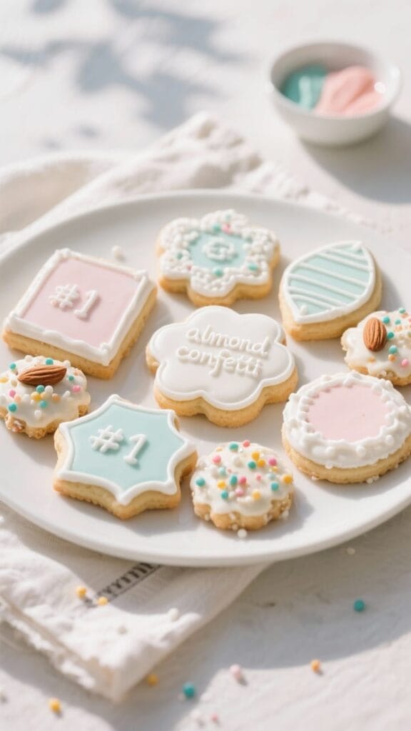 - Almond confetti: Use almond extract in both dough and icing, then decorate with nonpareils while the icing is wet.