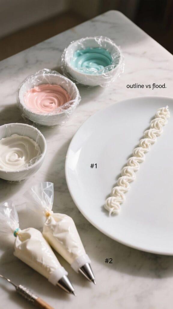 - Adjust consistencies: Outline icing: Keep a small portion thick for clean edges.