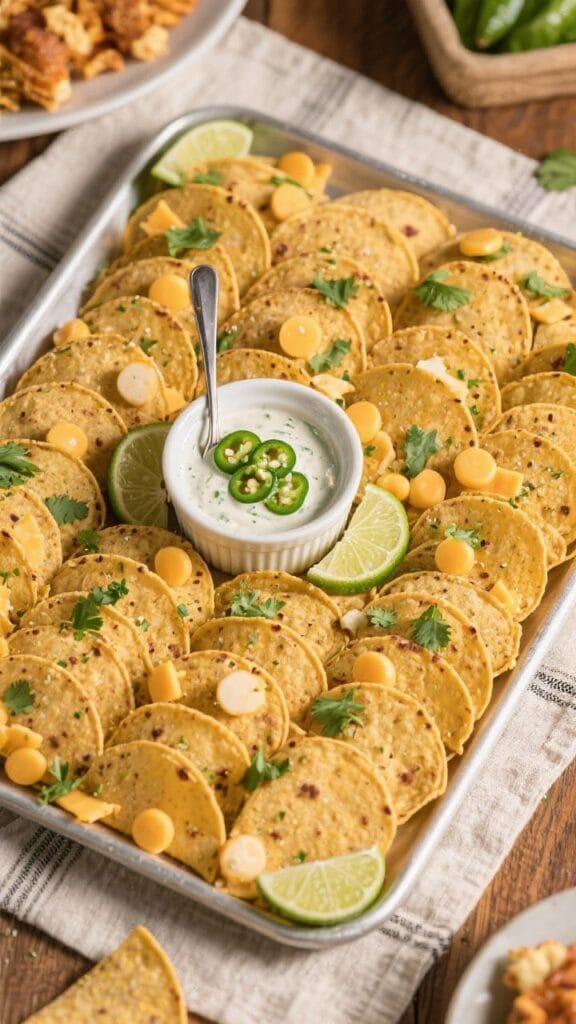 They’re built on mini flour tortillas that crisp up like chips but hold more toppings. A seasoned chicken-and-bean filling packs protein and flavor, while melty cheese and a punchy jalapeño-ranch drizzle seal the deal. They look impressive, taste indulgent, and require minimal cleanup.